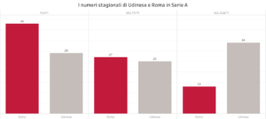I numeri della stagione in corso evidenziano un divario netto soprattutto in fase difensiva: l’Udinese ha subito 34 gol in Serie A, quasi il triplo rispetto ai 13 incassati dalla Roma, miglior difesa non solo in Italia ma anche nei top-5 campionati europei. In attacco invece i valori sono più equilibrati, con i giallorossi a quota 27 reti e i friulani a 25.